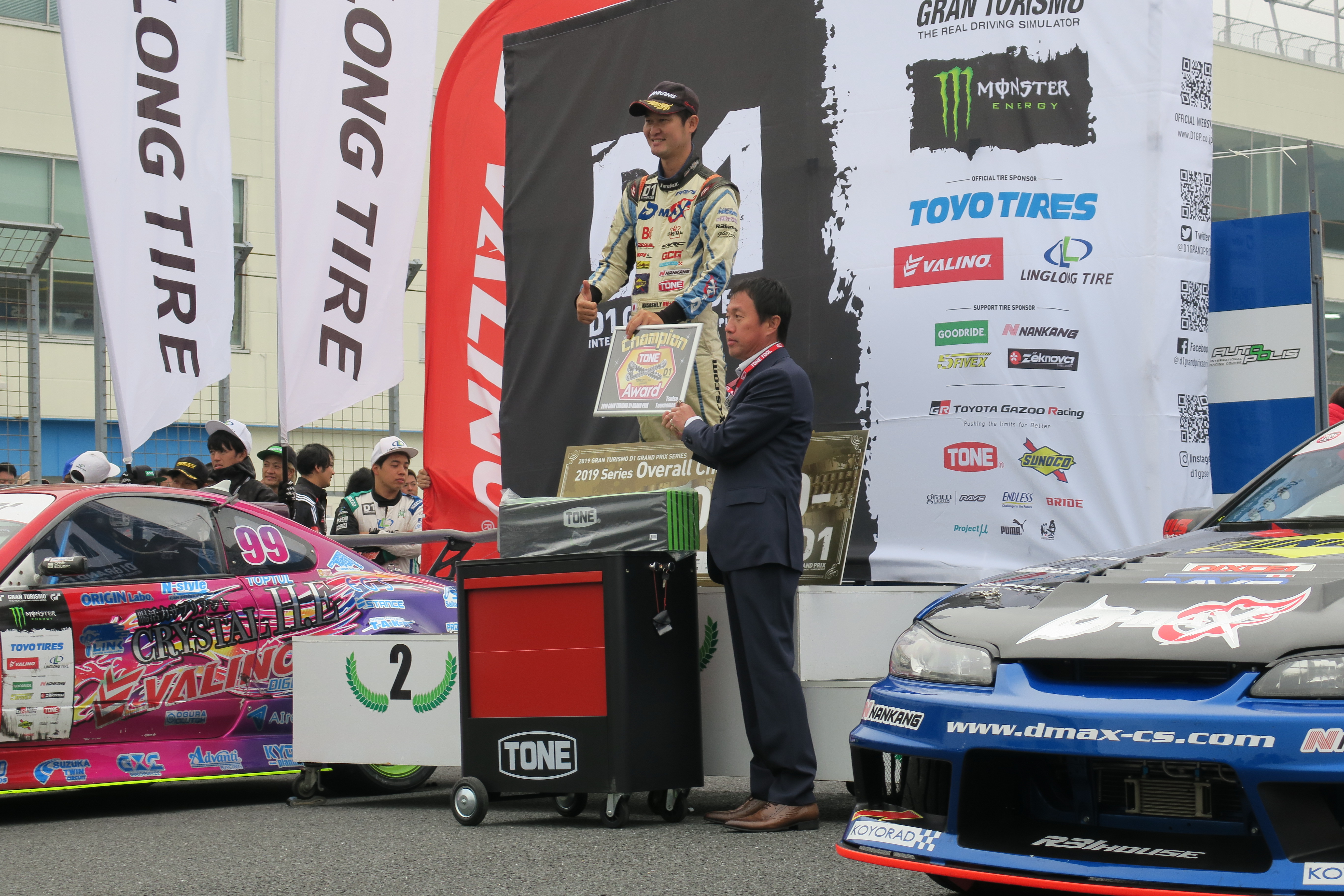 TONEサポートドライバーでは日比野哲也選手も年間シリーズ単走ランキングで2位に輝きました。日比野選手のすごいところは、今年のD1GP開幕戦(筑波)の単走優勝に始まり、ロシアのRDSシリーズ、中国のDCGPシリーズでも優勝と、3カ国のシリーズすべてで優勝を果たしているところ。